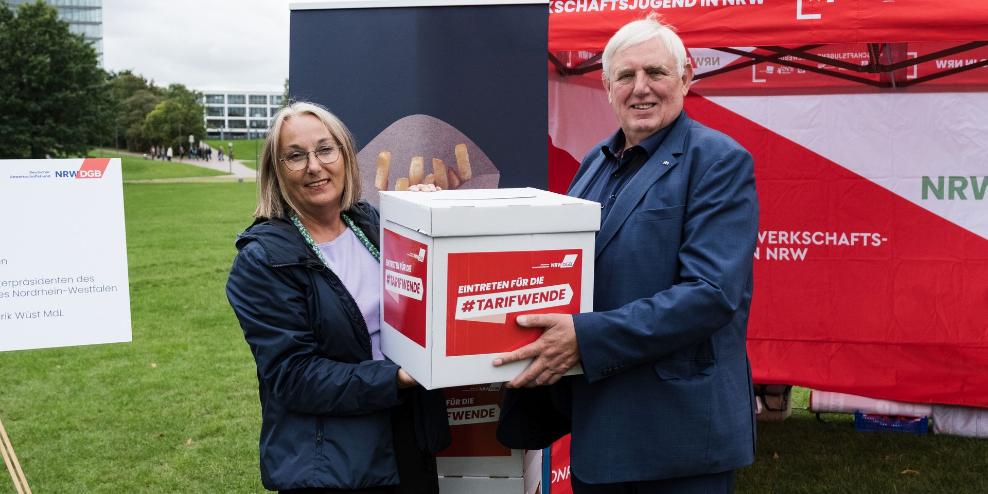 Mit einer Aktion vor dem Landtag haben wir - gemeinsam mit unseren acht Mitgliedsgewerkschaften - unserer Forderung nach einem wirksamen Tariftreuegesetz Nachdruck verliehen und NRW-Arbeitsminister Karl-Josef Laumann 7.000 unterschriebene Postkarten überreicht, mit denen sich Bürger*innen aus NRW für ein Tariftreuegesetz stark machen.