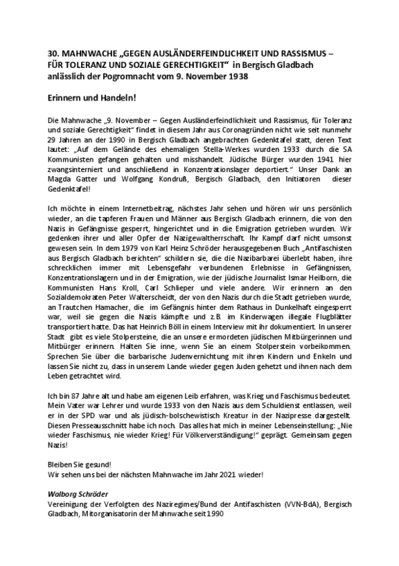 Ich möchte in einem Internetbeitrag, nächstes Jahr sehen und hören wir uns persönlich wieder, an die tapferen Frauen und Männer aus Bergisch Gladbach erinnern, die von den Nazis in Gefängnisse gesperrt, hingerichtet und in die Emigration getrieben wurden. Wir gedenken ihrer und aller Opfer der Nazigewaltherrschaft. Ihr Kampf darf nicht umsonst gewesen sein. In dem 1979 von Karl Heinz Schröder herausgegebenen Buch „Antifaschisten aus Bergisch Gladbach berichten“ schildern sie, die die Nazibarbarei überlebt haben, ihre schrecklichen immer mit Lebensgefahr verbundenen Erlebnisse in Gefängnissen, Konzentrationslagern und in der Emigration, wie der jüdische Journalist Ismar Heilborn, die Kommunisten Hans Kroll, Carl Schlieper und viele andere. Wir erinnern an den Sozialdemokraten Peter Walterscheidt, der von den Nazis durch die Stadt getrieben wurde, an Trautchen Hamacher, die im Gefängnis hinter dem Rathaus in Dunkelhaft eingesperrt war, weil sie gegen die Nazis kämpfte und z.B. im Kinderwagen illegale Flugblätter transportiert hatte. Das hat Heinrich Böll in einem Interview mit ihr dokumentiert. In unserer Stadt gibt es viele Stolpersteine, die an unsere ermordeten jüdischen Mitbürgerinnen und Mitbürger erinnern. Halten Sie inne, wenn Sie an einem Stolperstein vorbeikommen. Sprechen Sie über die barbarische Judenvernichtung mit ihren Kindern und Enkeln und lassen Sie nicht zu, dass in unserem Lande wieder gegen Juden gehetzt und ihnen nach dem Leben getrachtet wird.