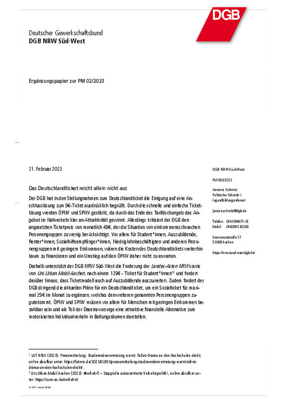 Durch das Deutschlandticket soll der Umstieg auf den ÖPNV und SPNV gefördert werden. Dies ist für das Gelingen einer ökologisch nachhaltigen Verkehrswende elementar. Damit der Umstieg auch stattfindet, muss auch das Angebot entsprechend ausgebaut werden. Dringend nötig sind daher Investitionen in die Verkehrsinfrastruktur und die dringende Modernisierung des ÖPNV und SPNV. „Betriebe und Gewerbegebiete müssen so an den ÖPNV angebunden werden, dass die Taktung der Buslinien den Schichtplänen der Betriebe entspricht. Wenn Arbeitsplatz, KiTa, Uni oder Schule nicht mit dem ÖPNV erreichbar sind, wird die Verkehrswende an Akzeptanz in der Bevölkerung verlieren und möglicherweise nicht gelingen,“ so das Fazit von Lisa Lang, Vorsitzende des DGB in Aachen.