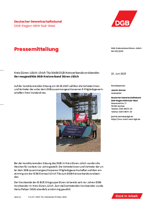 Bei der konstituierenden Sitzung des DGB im Kreis Düren-Jülich wurden die Weichen für weitere vier Jahre gestellt. Die Vertreterinnen und Vertreter der unter dem DGB zusammengeschlossenen Mitgliedsgewerkschaften wählten einstimmig von der IG BCE erneut Ulrich Titz zum DGB-Kreisverbandsvorsitzenden.