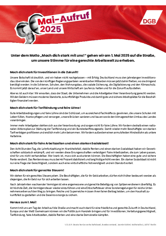 Der DGB ruft alle Bürgerinnen und Bürger dazu auf, sich solidarisch zu zeigen und den Internationalen Tag der Arbeit als Tag der gemeinsamen Wertschätzung und des Engagements für eine gerechte Arbeitswelt zu begehen.