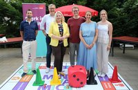 Das Gewerkschaftsteam hatte auf der Bistro-Terrasse der Diakonie im Kirchenkreis Recklinghausen das seit einiger Zeit genutzte Spielfeld „Mensch wähl mich!“ ausgerollt - eine Mischung aus „Mensch, ärgere Dich nicht“ und „Monopoly“. Die Bürgermeisterkandidat*innen Marlies Greve (FDP), Jan Matzoll (Grüne), Anja-Christina Rex (CDU) und Axel Tschersich (SPD) stellten sich - und ihre farblich passenden Figuren (gelb, grün, schwarz, rot) in die Startposition.