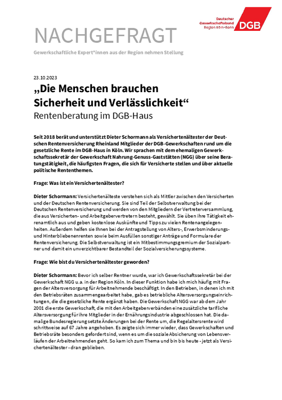 Dieter Schormann: In der Tat: Wenn beispielsweise aus neoliberalen Kreisen Rufe nach einem späteren Renteneintrittsalter durch die Medien gehen, steigt an den nachfolgenden Tagen der Bedarf nach Beratung und Information. Ob gewollt oder nicht gewollt, führen die Forderungen zu einer weiter zunehmenden Verunsicherung der Menschen. Gerade in der Transformation von Wirtschaft und Gesellschaft und in Zeiten von weltweiten Krisen, brauchen die Menschen Sicherheit und Verlässlichkeit. Die gesetzliche Rente ist kein Almosen des Staates, sondern wird im Wesentlichen aus Beiträgen der gesetzlich pflichtversicherten Arbeitnehmerinnen und Arbeitnehmer und deren Arbeitgebern finanziert. Mit den Beiträgen darf nicht nach Belieben jongliert und spekuliert werden.