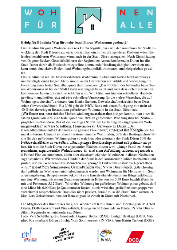 „Wir freuen uns, dass sich der Stadtentwicklungsausschuss durchringen konnte, statt einer flexiblen Quote von 20% eine feste Quote von 30% an geförderten Wohnungsbau bei Neubauprojekten zu etablieren. Das ist ein wichtiger Schritt zur Entlastung des angespannten Wohnungsmarktes,“ so Vera Schellberg, Pfarrerin der ev. Gemeinde zu Düren. „Der Baulandbeschluss enthält dennoch eine gewisse Flexibilität“, entgegnet ihre Kollegin der Armutskonferenz. Gemeint ist, dass Investoren nun die Wahl haben, 30% der Bruttogeschossfläche für den geförderten Wohnungsbau zu errichten oder alternativ der Stadt Düren 30% der Nettobaulandfläche zu veräußern. „Nach jetziger Beschlusslage scheint es Spielraum zu geben, für was die Stadt Düren die angekauften Flächen nutzen wird. „Junge Familien, Seniorenwohnen, experimentelle Wohnformen o. ä.“ sind einer Aufzählung in ihrem sogenannten 8-Punkte-Plan zu entnehmen, allein über die abschließenden Miethöhen in diesen Neubauten sagt dies nichts. Wir werden das Handeln der Stadt in den kommenden Jahren beobachten und prüfen, wie viel Wohnraum für Menschen mit geringem Einkommen tatsächlich geschaffen wird, “ erklärt York Sommereisen, Geschäftsführer von IN VIA Düren-Jülich. „Gleichzeitig darf geförderter Wohnraum nicht gleichgesetzt werden mit Wohnraum für Menschen im Sozialleistungsbezug. Beispielsweise bekommt eine Einzelstehende Person im Bürgergeldbezug nur eine Wohnung mit einem Quadratmeterpreis in Höhe von bis 5,59 Euro bezahlt (Familie mit drei Personen: 5,12 Euro). Wird eine Wohnung im geförderten Wohnungsbau gebaut, darf eine Miete bis 6,00 Euro je Quadratmeter kosten, somit wird eine große Personengruppe von vorneherein ausgeschlossen. Dass dies nicht passiert, darauf muss die Stadt Düren achten, erklärt Lars Ochsenbruch, von der Beratungsstelle Arbeit in Düren mit Nachdruck.