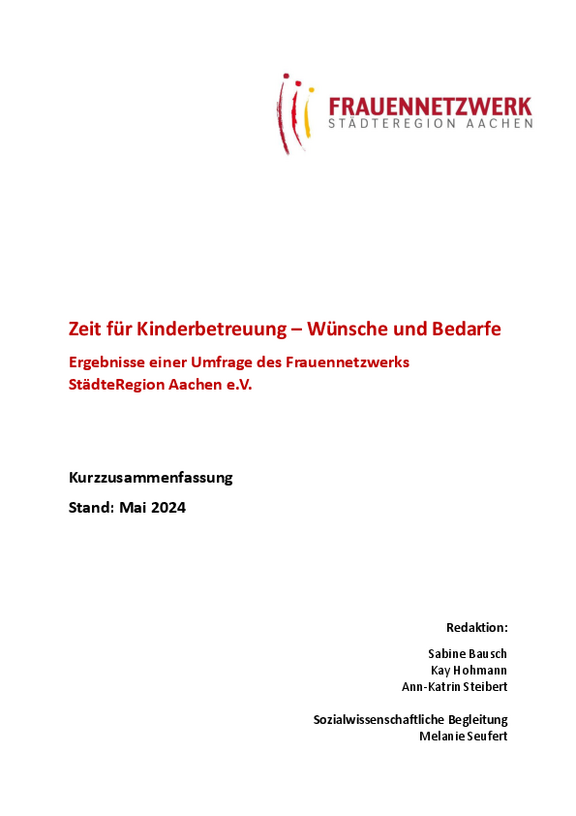 Die Projektgruppe „flexible Kinderbetreuung“ des Frauennetzwerks StädteRegion Aachen e.V. hat die Online-Umfrage „Zeit für Kinderbetreuung?! – Wünsche und Bedarfe“ erstellt und im Herbst 2023 auf den Weg gebracht. Der Fokus wurde auf die Organisation der Kinderbetreuung und die Bedarfe von Eltern minderjähriger Kinder unter 14 Jahren gelegt, mit dem Ziel einen Lagebericht für die Stadt und Städteregion Aachen zu erhalten.