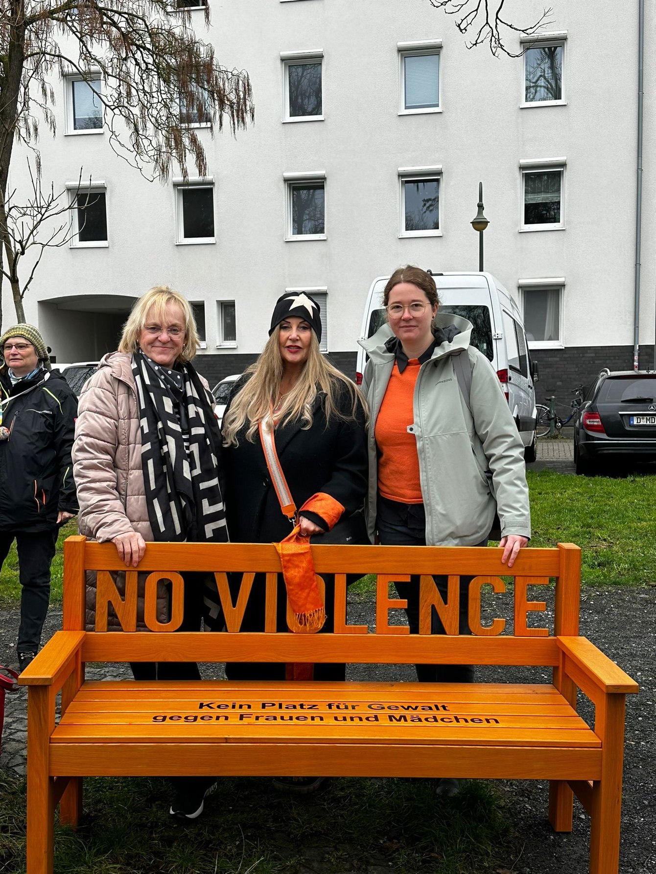 Der DGB Düsseldorf hat heute mit einer orangen Bank der Kampagne ,,No Violence – keine Gewalt an Frauen und Mädchen!‘‘ am Hexengedenkstein* in Gerresheim ein Zeichen gegen Gewalt an Frauen