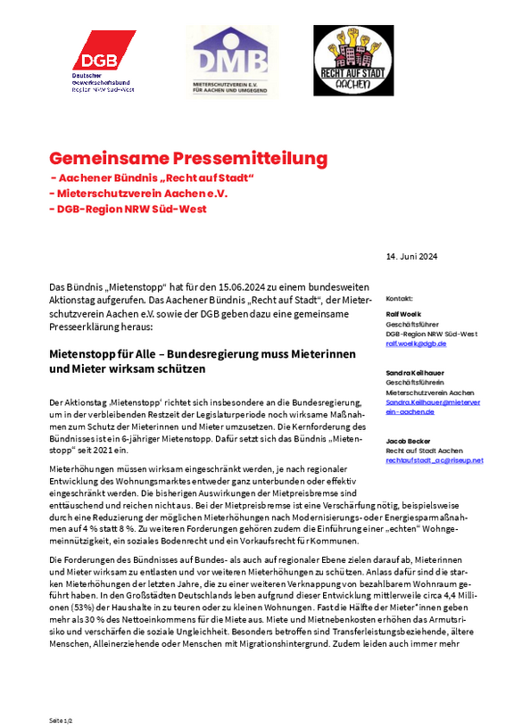 Das Bündnis „Mietenstopp“ hat für den 15.06.2024 zu einem bundesweiten Aktionstag aufgerufen. Das Aachener Bündnis „Recht auf Stadt“, der Mieterschutzverein Aachen e.V. sowie der DGB geben dazu eine gemeinsame