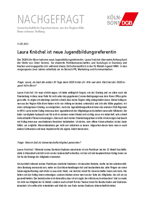 Laura Knöchel: Da ich im April angefangen habe, stand natürlich alles im Zeichen des ersten Mais. Der Tag der Arbeit ist für uns als Gewerkschafter:innen traditionell einer der Höhepunkte des Jahres. Bereits im vergangenen Jahr wurden auf Grund der Corona-Pandemie viele Aktionen, die akribisch und nicht selten mit langem Vorlauf geplant und organisiert worden waren, teilweise sehr kurzfristig abgesagt. Auch in diesem Jahr bestimmte die Pandemie die Ausgestaltung des ersten Mais. Schon vor meinem Arbeitsbeginn hatten sich die Vorstandsmitglieder der DGB-Jugend Köln darauf verständigt, neben der Jugendrede auf der DGB-Kundgebung auf dem Heumarkt in Köln, auch ein digitales Angebot über die Social Media-Plattformen bereitzustellen, wo ich sie gerne mitunterstützt habe. So konnten wir auf unsere Forderungen als Gewerkschaftsjugend am Tag der Arbeit aufmerksam machen und erzielten so mit unseren Beiträgen eine große Reichweite.