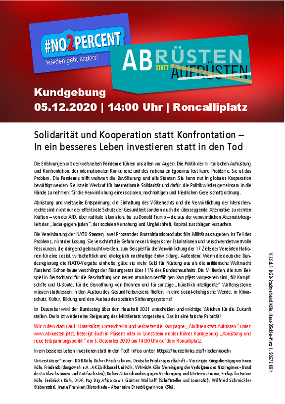 In Köln findet am 05.12.2020, 14:00 Uhr, eine Kundgebung auf dem Roncalliplatz statt – unter Einhaltung der Corona-Schutzverordnung: Ohne Abrüstung gibt es weniger Klimaschutz, weniger Gesundheitsschutz, weniger soziale Gerechtigkeit. Der Aufruf ist als Anlage beigefügt.