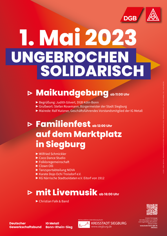Michael Korsmeier, Geschäftsführer und 1. Bevollmächtigter der IG Metall Bonn-Rhein-Sieg: „Corona, Krieg in Europa, Energiekrise und Inflation: Die Vielfachkrisen haben ein erhebliches Spaltungs- und Polarisierungspotential und gefährden den gesellschaftlichen Zusammenhalt. Gewerkschaften stehen für Zusammenhalt und solidarisches Handeln. Nur gemeinsam können wir die Krisen überwinden, den Wohlstand sichern und eine lebenswerte Zukunft gestalten. Das werden wir am 1. Mai deutlich machen.“