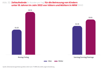 Die Zahl der sozialversicherungspflichtig beschäftigten Frauen ist in den vergangenen Jahren zwar deutlich gestiegen, liegt aber immer noch unter der von Männern (56,1 Prozent vs. 64,9 Prozent). Berufstätige Frauen arbeiten zudem deutlich öfter in sogenannter atypischer Beschäftigung als Männer. 76,1 Prozent der sozialversicherungspflichtigen Teilzeitjobs und 59,4 Prozent der Minijobs in NRW entfallen auf Frauen. Und obwohl Frauen in NRW oftmals besser qualifiziert sind als Männer, arbeiten sie häufiger in Tätigkeiten, in denen das Anforderungsniveau geringer ist. Während 59,2 Prozent der sozialversicherungspflichtig beschäftigten Frauen über einen anerkannten Berufsabschluss verfügen, sind es bei Männern nur 55,1 Prozent. Auch beim Gehalt liegen die Geschlechter auseinander: 2025 verdienten Frauen in NRW im Schnitt 15 Prozent weniger pro Stunde als Männer (unbereinigter Gender Pay Gap). Ein wichtiger Grund, warum Frauen ihre Arbeitszeit reduzieren und ihre beruflichen Ambitionen zurückstellen, ist die fehlende Vereinbarkeit von Familie und Beruf. Hier spielen fehlende oder unzuverlässige Angebote zur Kinderbetreuung eine Rolle, aber auch die ungleiche Verteilung von Care-Arbeit zwischen den Geschlechtern. Während Männer in NRW wöchentlich rund 20 Stunden für Haushaltstätigkeiten und Betreuung von Angehörigen aufbringen, sind es bei den Frauen fast 30 Stunden.