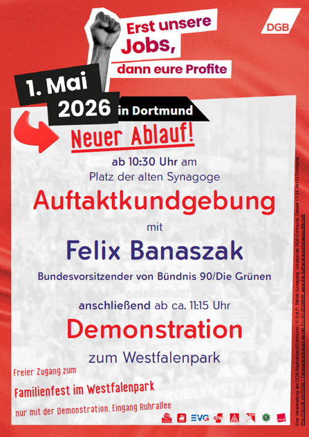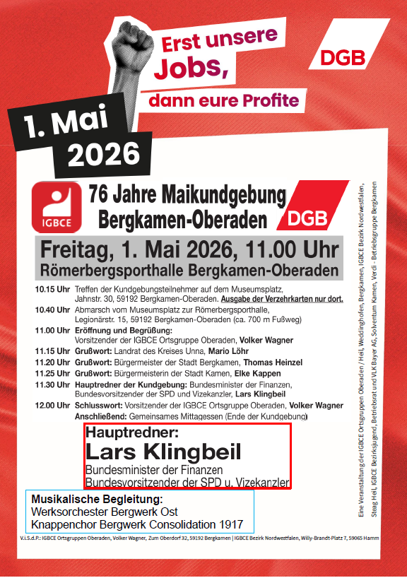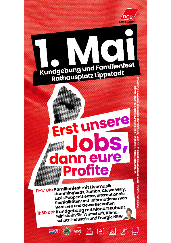 Als Hauptredner*innen sind in unserer Region neben der stellvertretenden verdi-Bundesvorsitzenden Andrea Kocsis und der stellvertretenden verdi-Landesleiterin Birgit Sperner, dem IG Metall Bezirksleiter Knut Giesler auch namhafte Vertreter aus der Bundes- und Landespolitik: SPD-Bundesvorsitzender und Bundesfinanzminister Lars Klingbeil, Bundesvorsitzender von Bündnis90/Die Grünen Felix Banaszak sowie die Wirtschaftsministerin und stellv. Ministerpräsidentin des Landes NRW, Mona Neubaur.