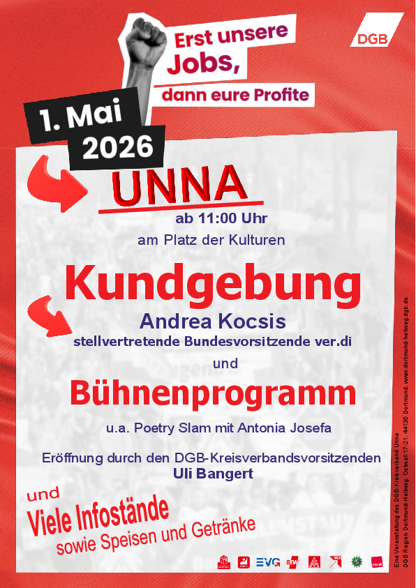 Unter dem Motto „Erst unsere Jobs, dann eure Profite“ gehen wir am 1. Mai 2026 auf die Straße – kämpferisch, solidarisch und entschlossen.