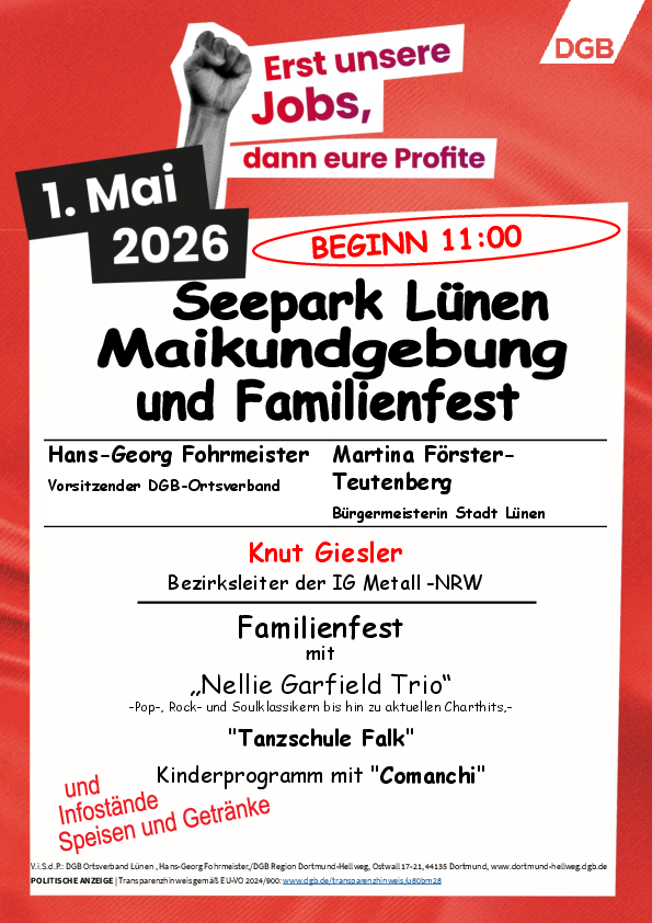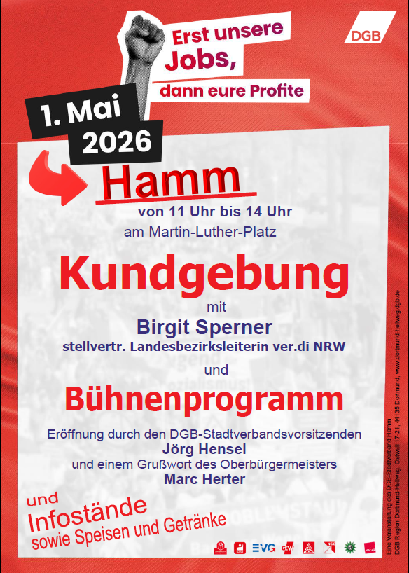 In der Region Dortmund-Hellweg finden in diesem Jahr Maiveranstaltungen in Hamm, Unna, Lünen, Bergkamen-Oberaden, Lippstadt und Dortmund statt.